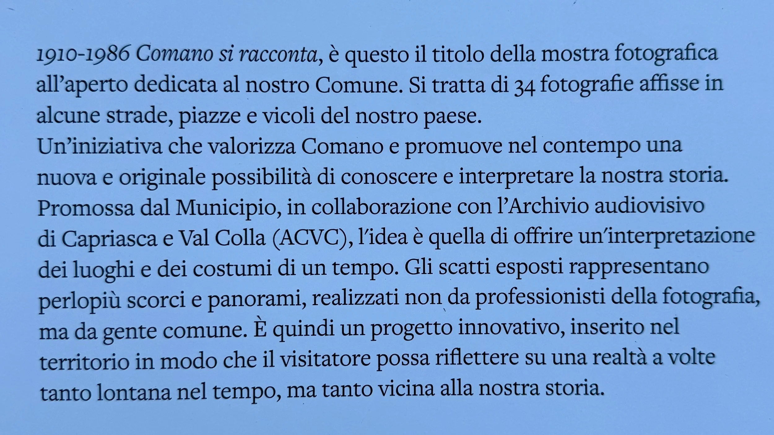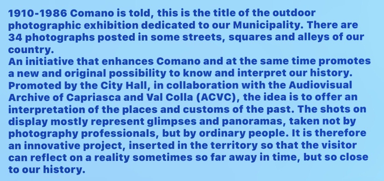 One of the old pictures posted throughout Comano. The city administrative building and the Oratory buildings are found in the forefront of this picture.